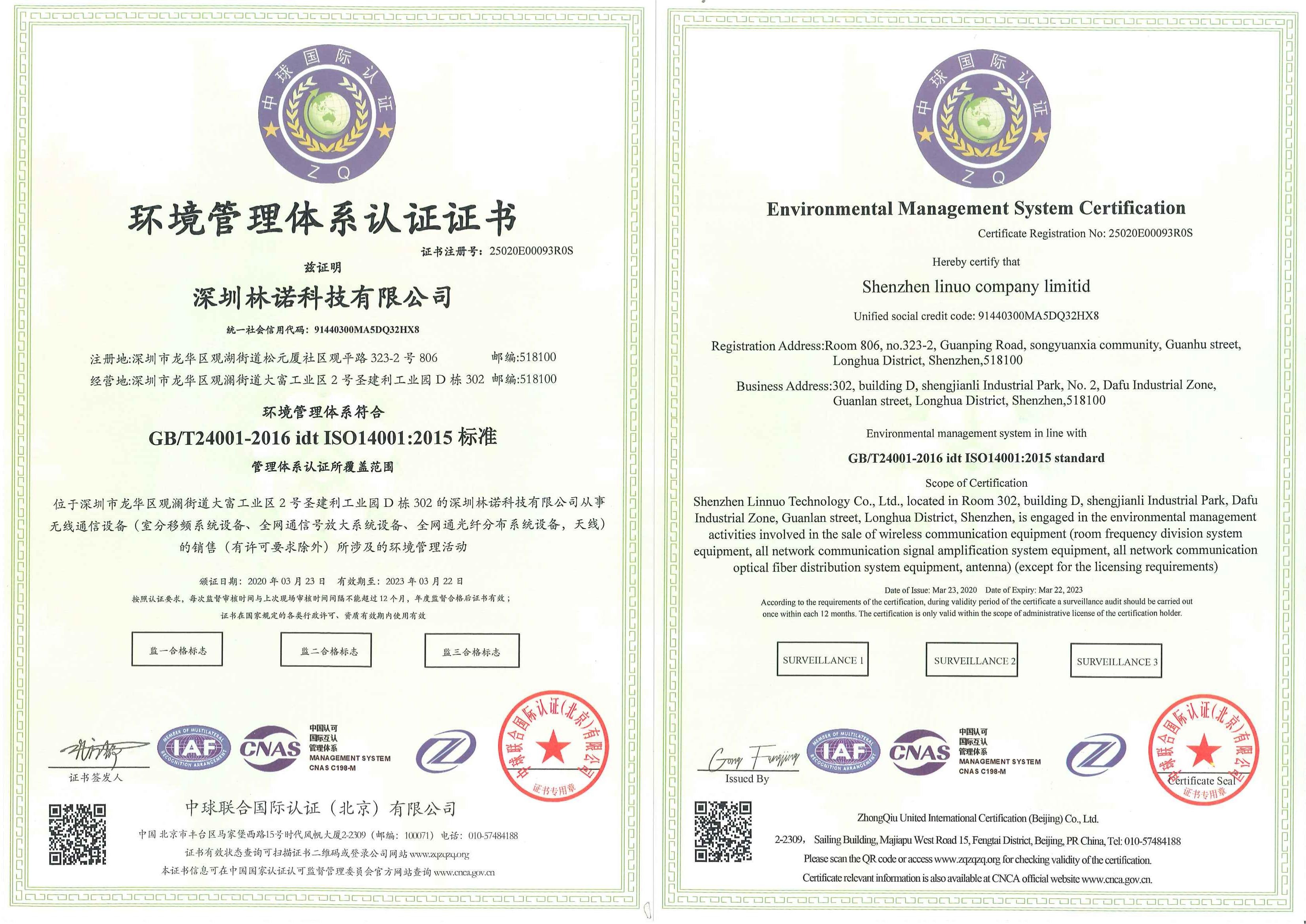 ISO14001 Environmental Management system certification certificate