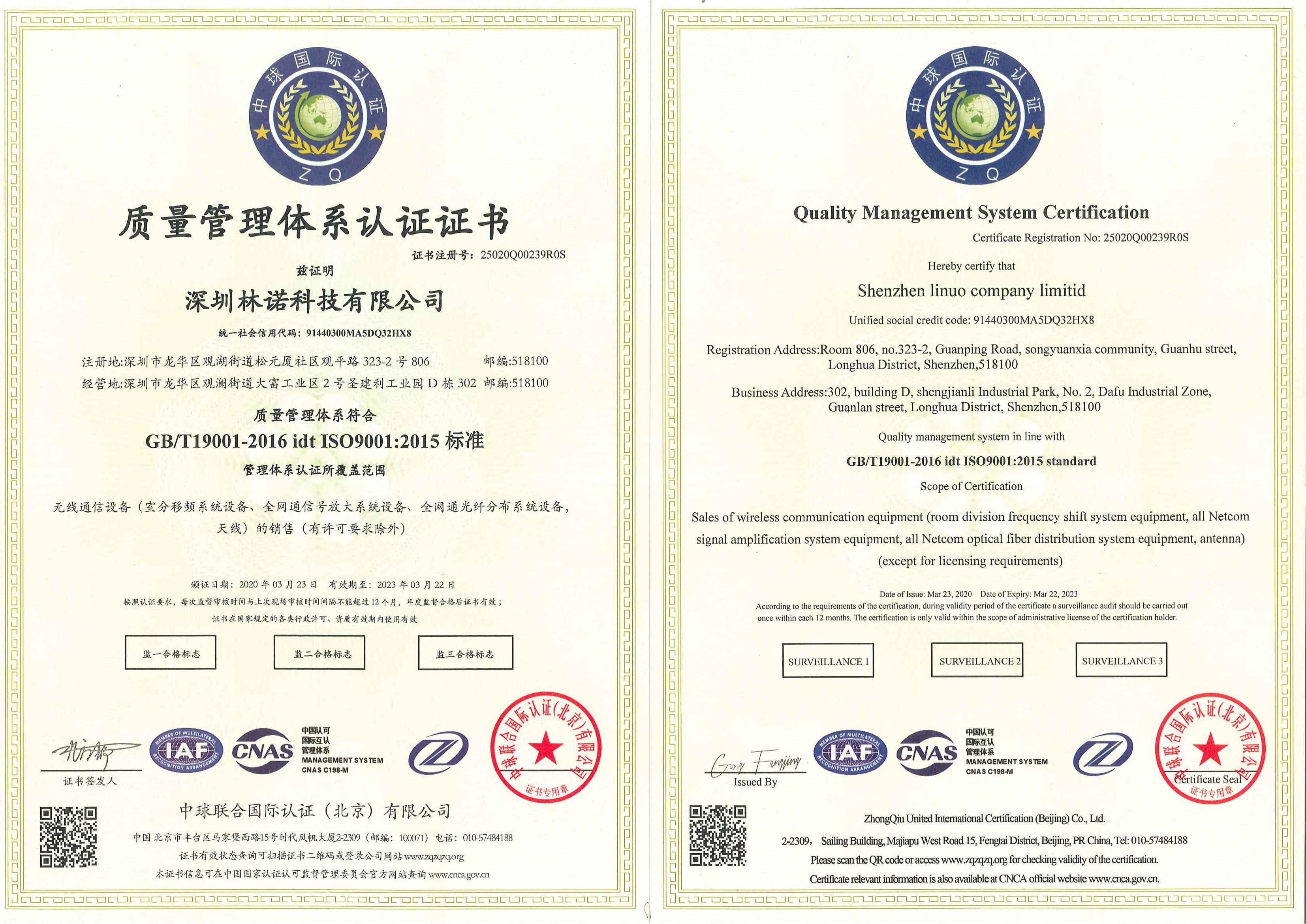 ISO9001 quality management system certificate